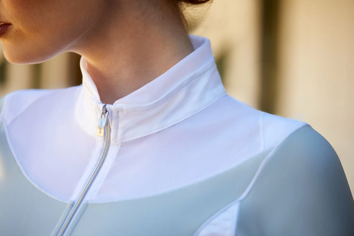 This cutting-edge show shirt provides the cues you need to elevate your performance in the show ring. Engineered compression panels prompt correct riding posture while allowing for maximum range of motion.ย