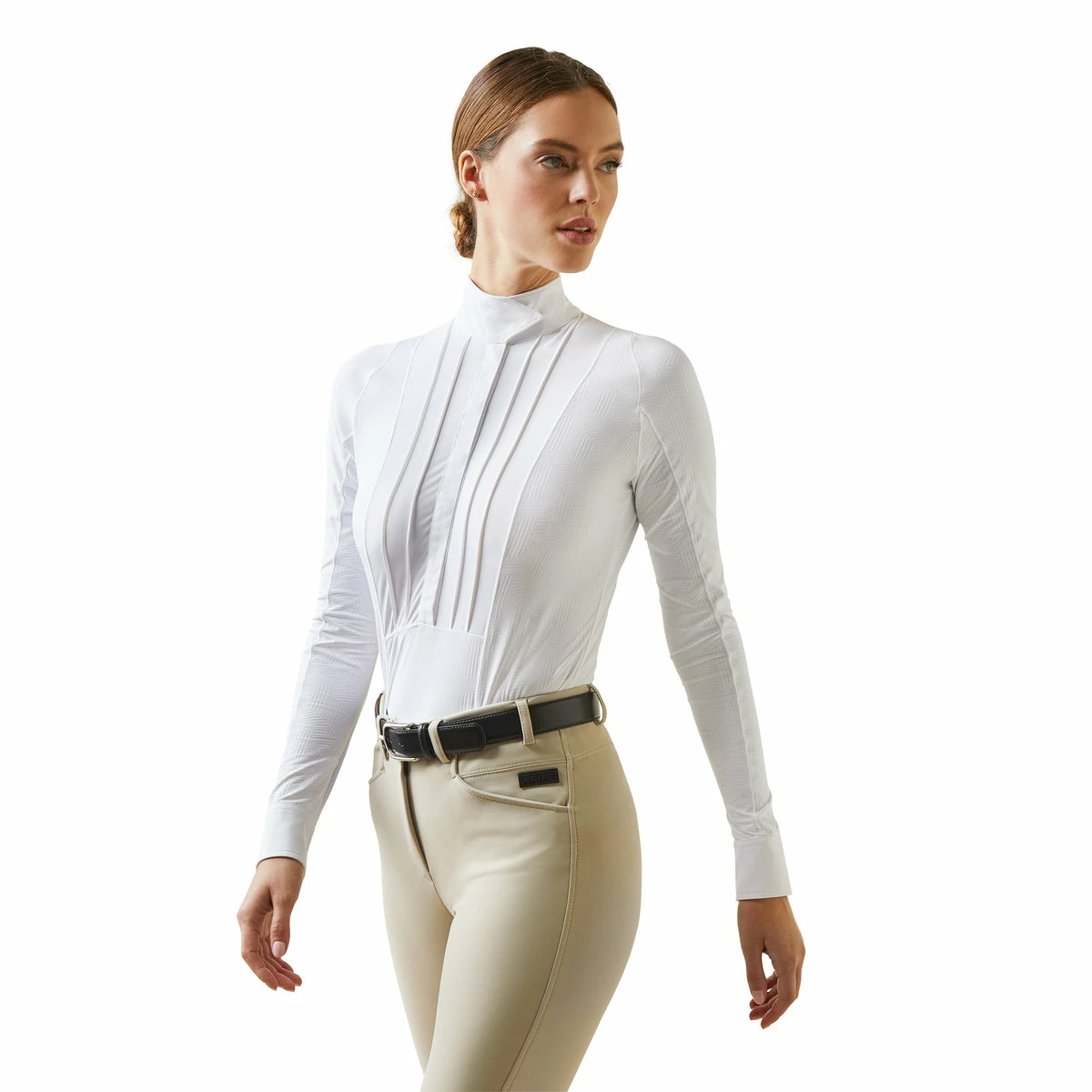If you haven’t seen the Ariat Luxe show shirt, you are in for a huge treat! This ultra-comfortable mesh show shirt is beautifully tailored and designed with the equestrian athlete in mind. The luxe fabric is breathable with all the features you would expect, wrap collar, pleated front placket and button cuffs. The design in the mesh is so subtle and adds a touch of elegance to complete your show look. This jacket looks FABULOUS under the Ariat Articoย Exhale Show Coat!ย