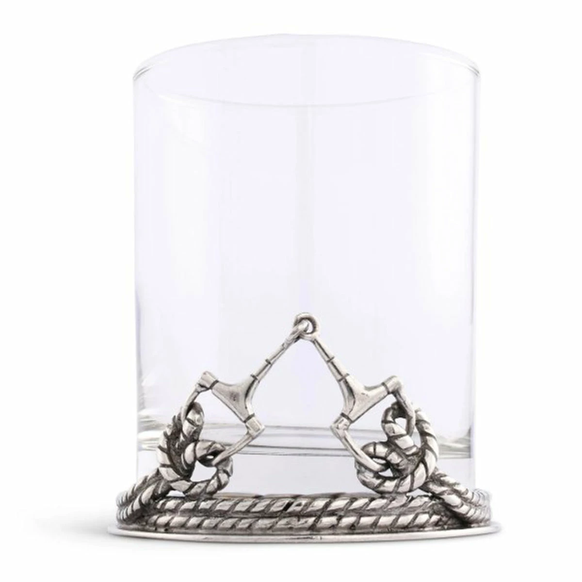 Perfect for any host or rider, the D Ring Bit Double Old Fashioned Glass offers an elegant way to enjoy teas and lemonades. A realistic French link snaffle bit extends into a downward-facing ‘V’ from its attachment point on the bottom-third of the glass. Intricate ropes create a layered border around the base. Service with style for Equestrians of any age.