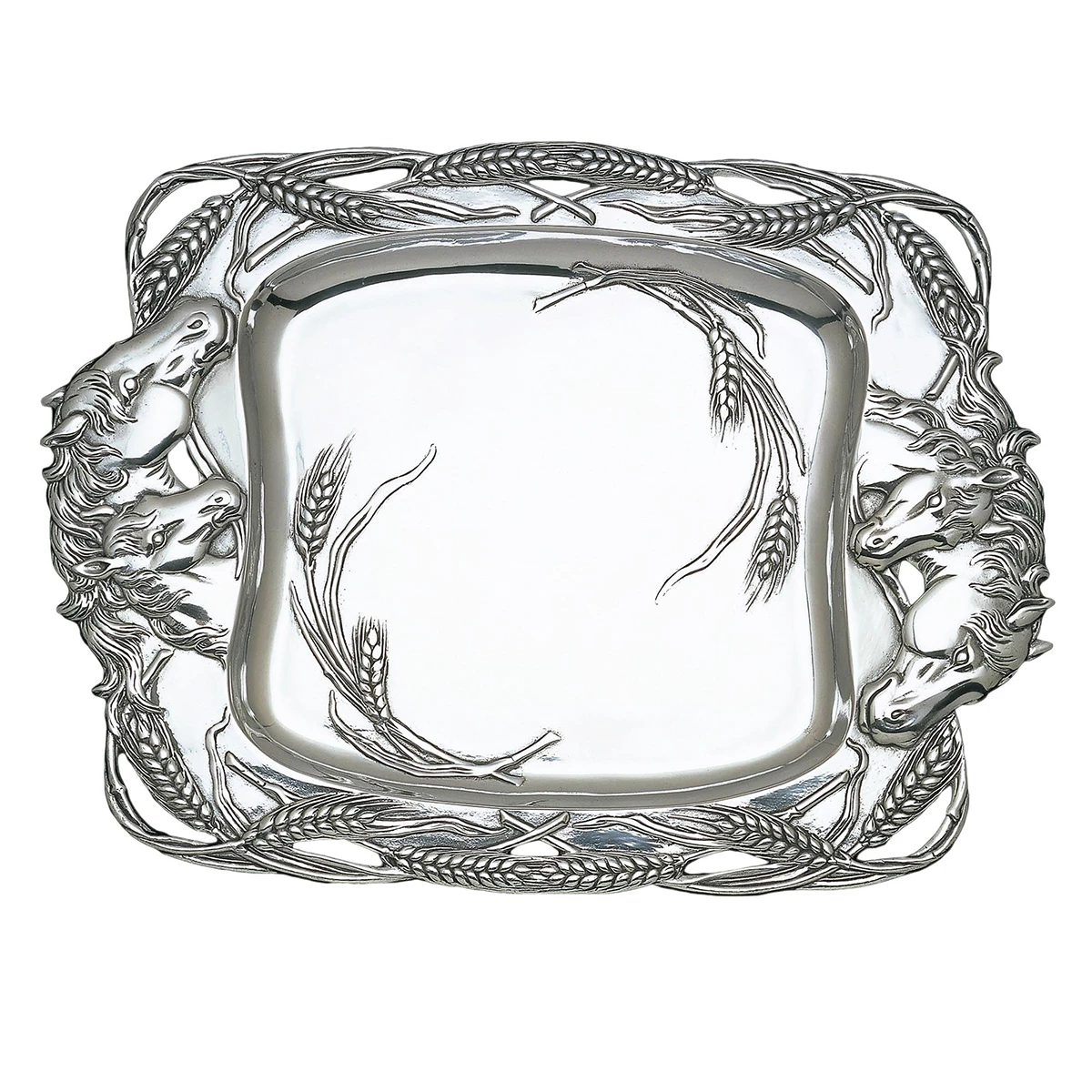 Groups of stallions mingle on either side of this handmade, aluminum dish as stalks of wheat form an openwork border around them. The incredible definition and detail within each design is both tangible and visible.