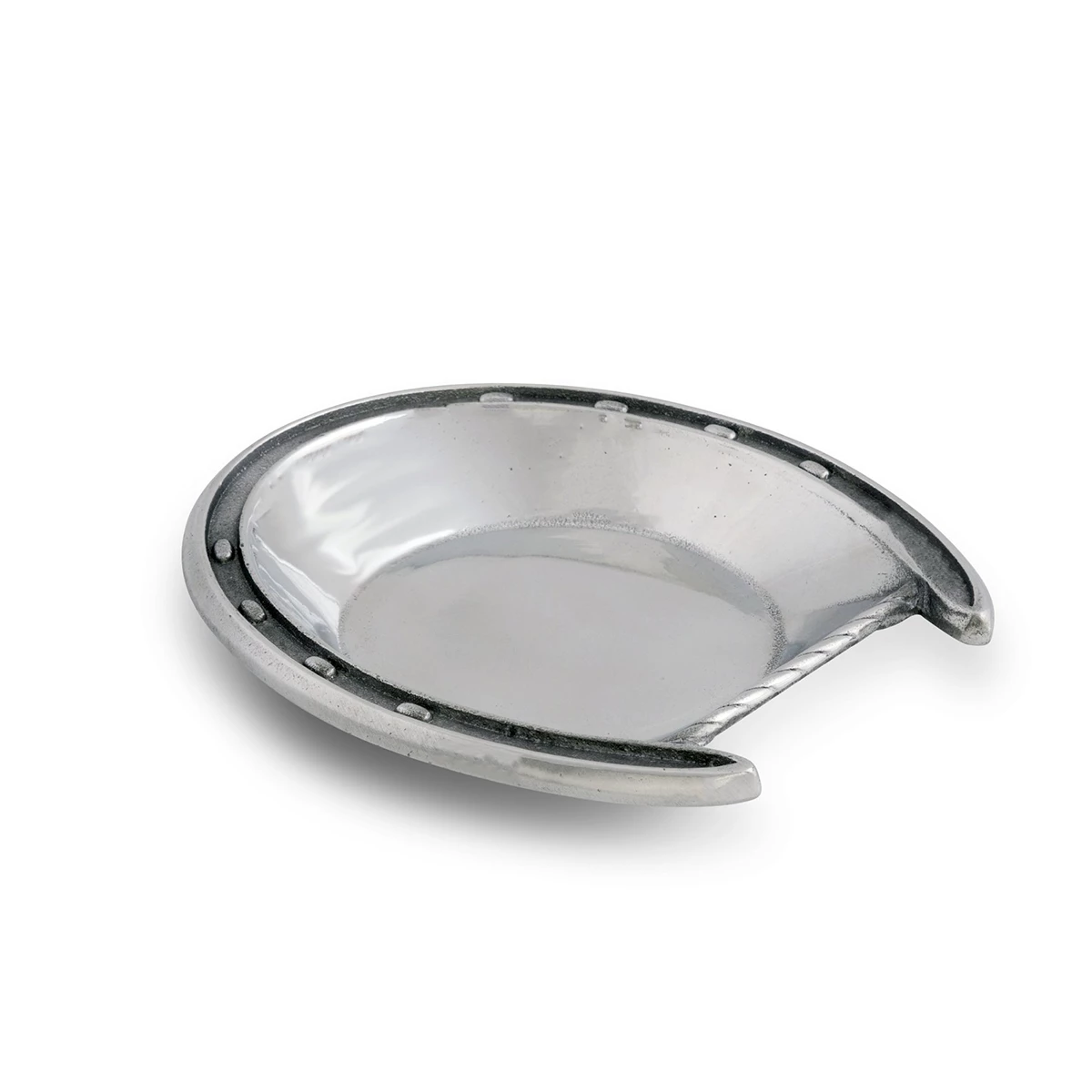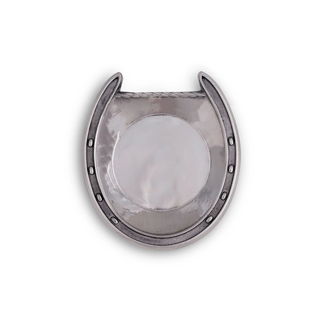 The unmistakable U-shape encloses the dish on three sides, while a ropy edge adorns an additional wall on the heel. Multiple nail notches are visible in the horseshoe, giving this handmade, aluminum bowl even more realistic detail.
