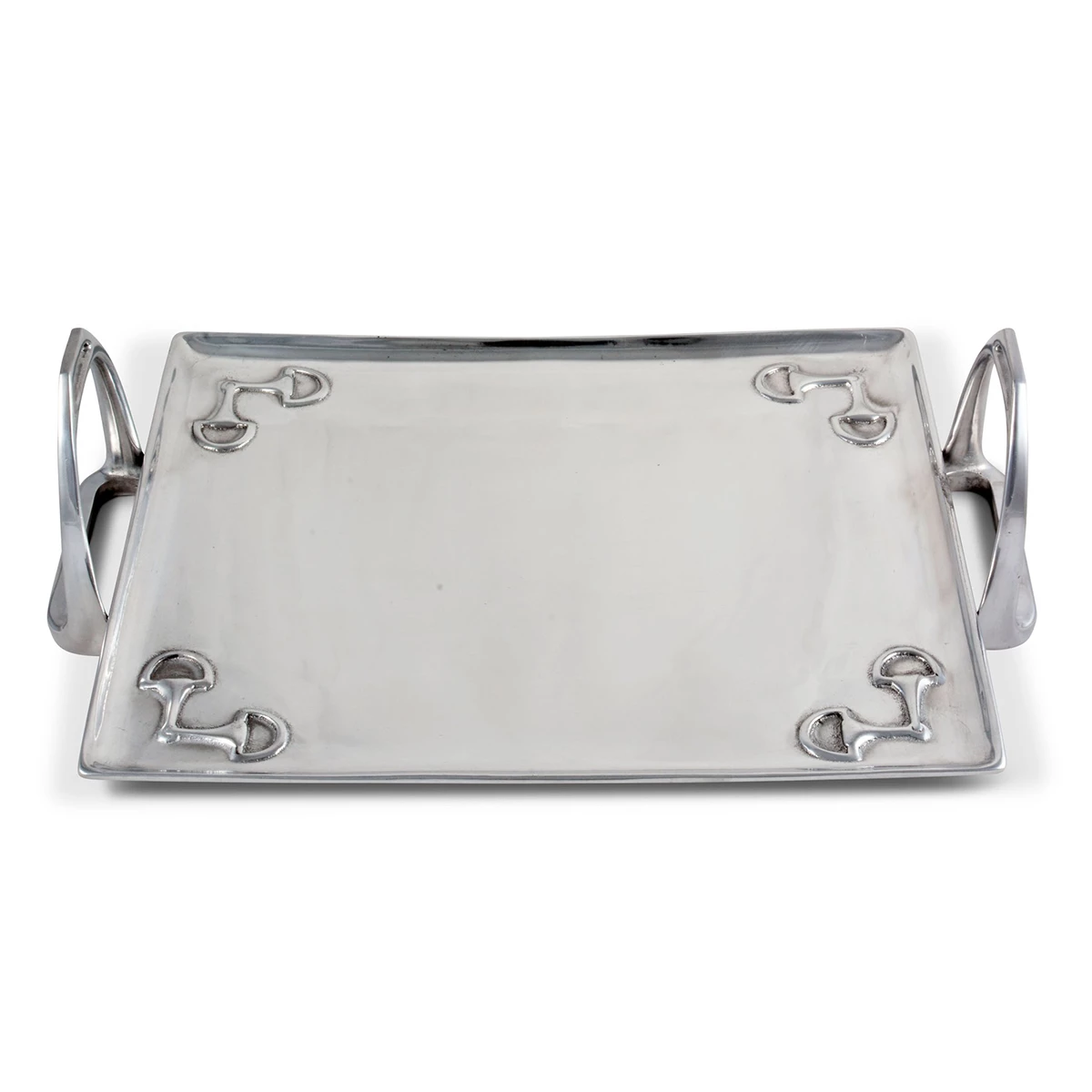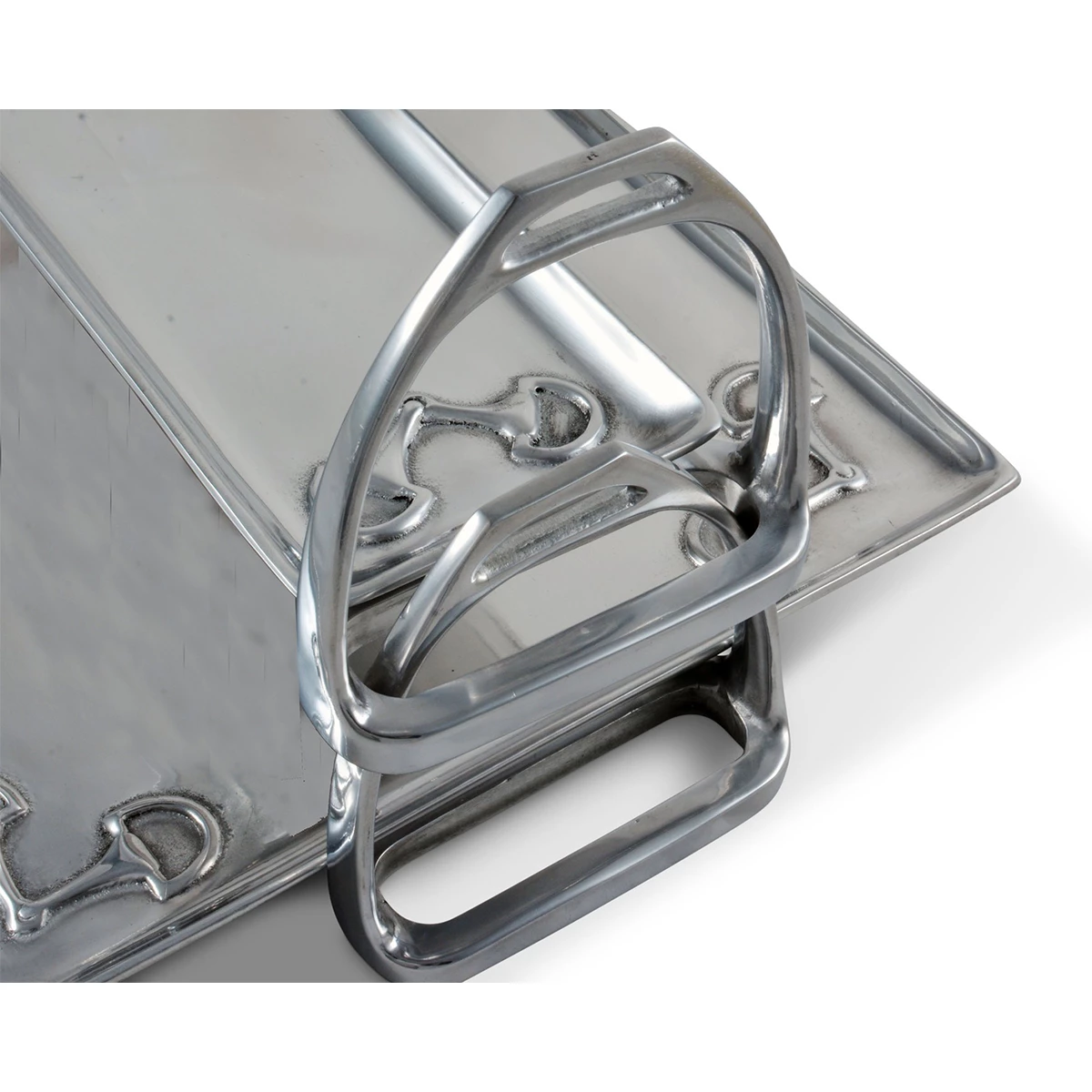Featuring a square shape, generous size with realistic stirrup irons serving as the handles, sleek equestrian design defines our large Arthur Court Equestrian Bit and Stirrups Serving Tray. Slightly raised edges allow for carrying without worry. Bas-relief D-bit designs decorate the four corners of the tray. This tray is highly engravable, with plenty of space for messages, just take to your local engraving shop when you receive it.
