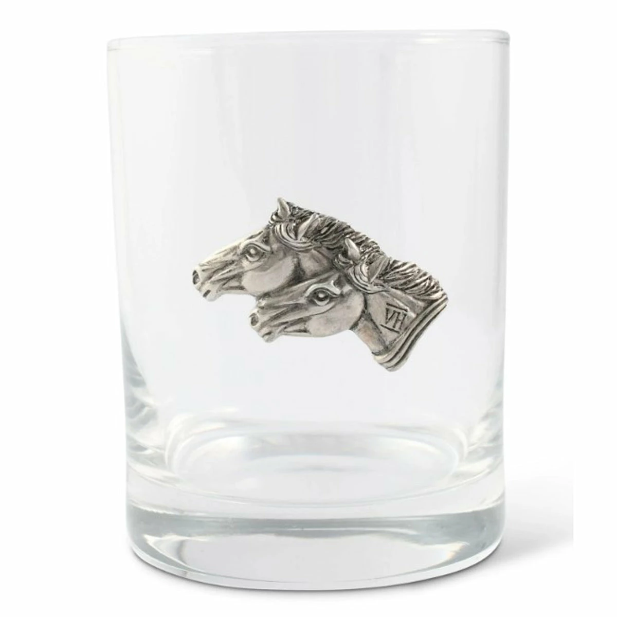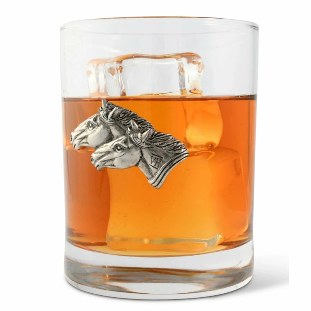Extend your equestrian-themed collection to the bar with this double old-fashioned glass. Embellished with horse heads in profile made of luxury-grade pewter, this glass looks handsome in the hand and puts a distinctive stamp on your signature cocktails.