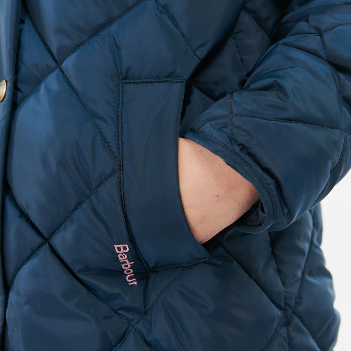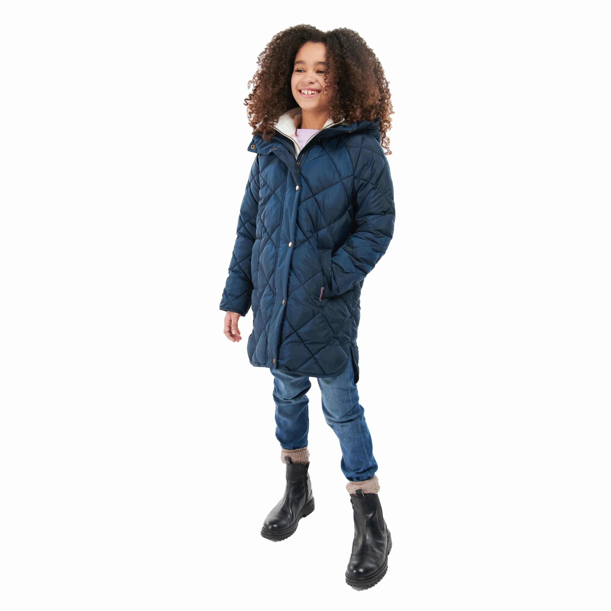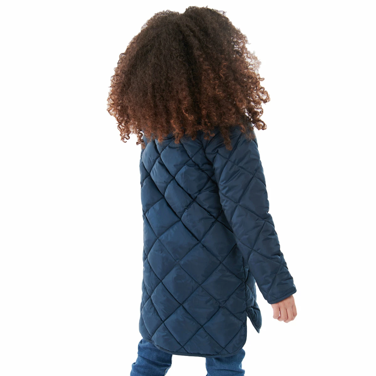 The Barbour Girl’s Sandyford Quilt Jacket is styled with a studded front fastening and large hood. This jacket also boasts a cozy lining.