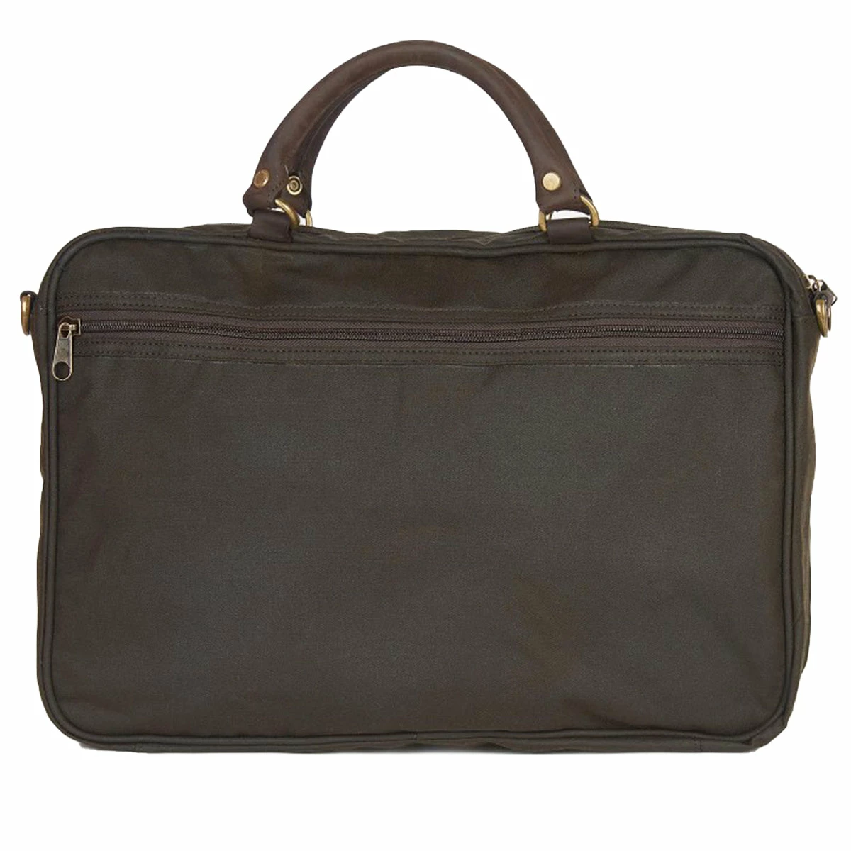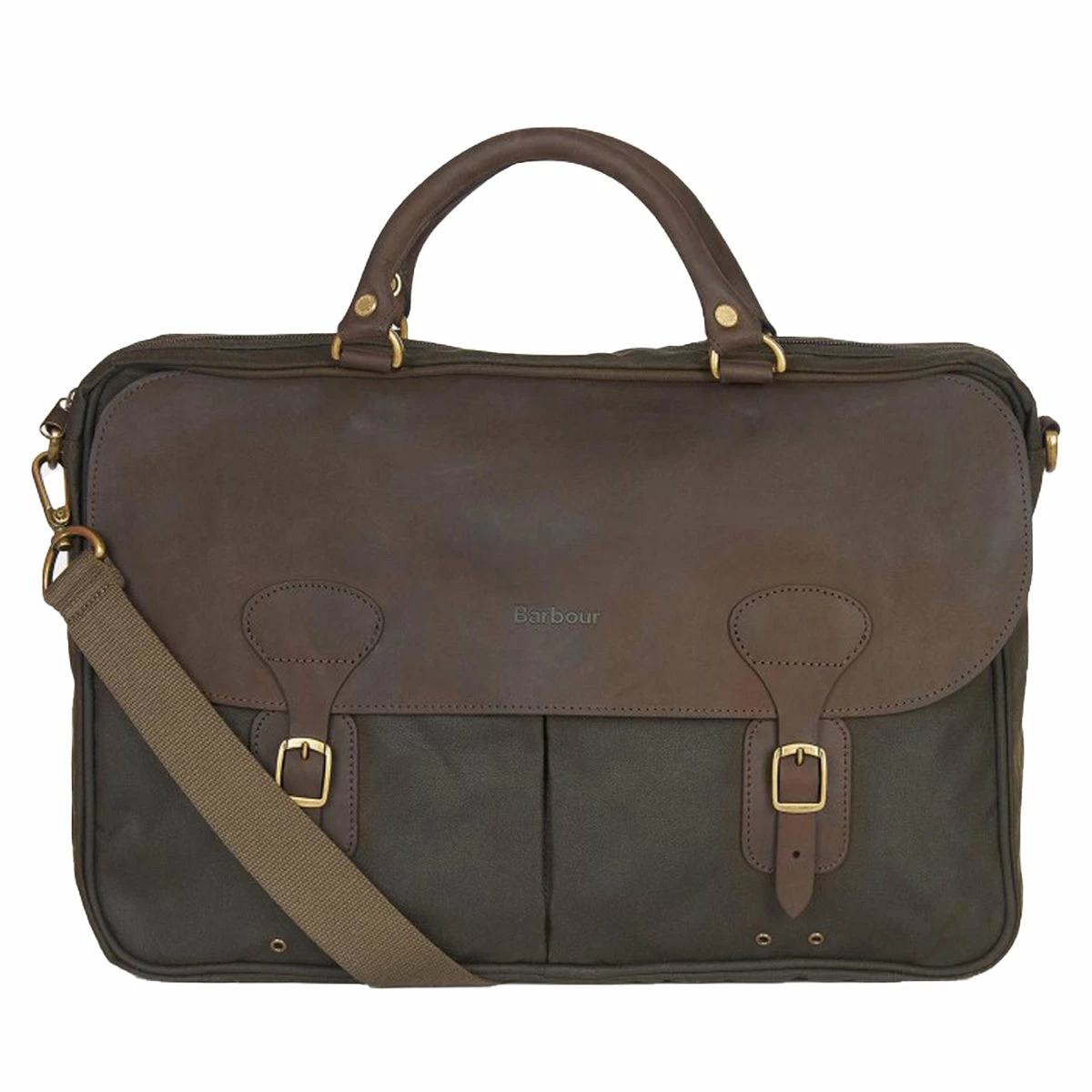The perfect update for your workday essentials, the Barbour Wax Leather briefcase is a stylish and durable way to hold a laptop along with any essential documents and accessories. Crafted from robust waxed cotton in classic olive, it features brass effect hardware throughout and a top flap and carry handles in soft waxed leather for a luxurious feel that’s sure to age beautifully. Also boasting a detachable webbing shoulder strap for added versatility, the bag is finished with a subtle Barbour logo embossed to the front.