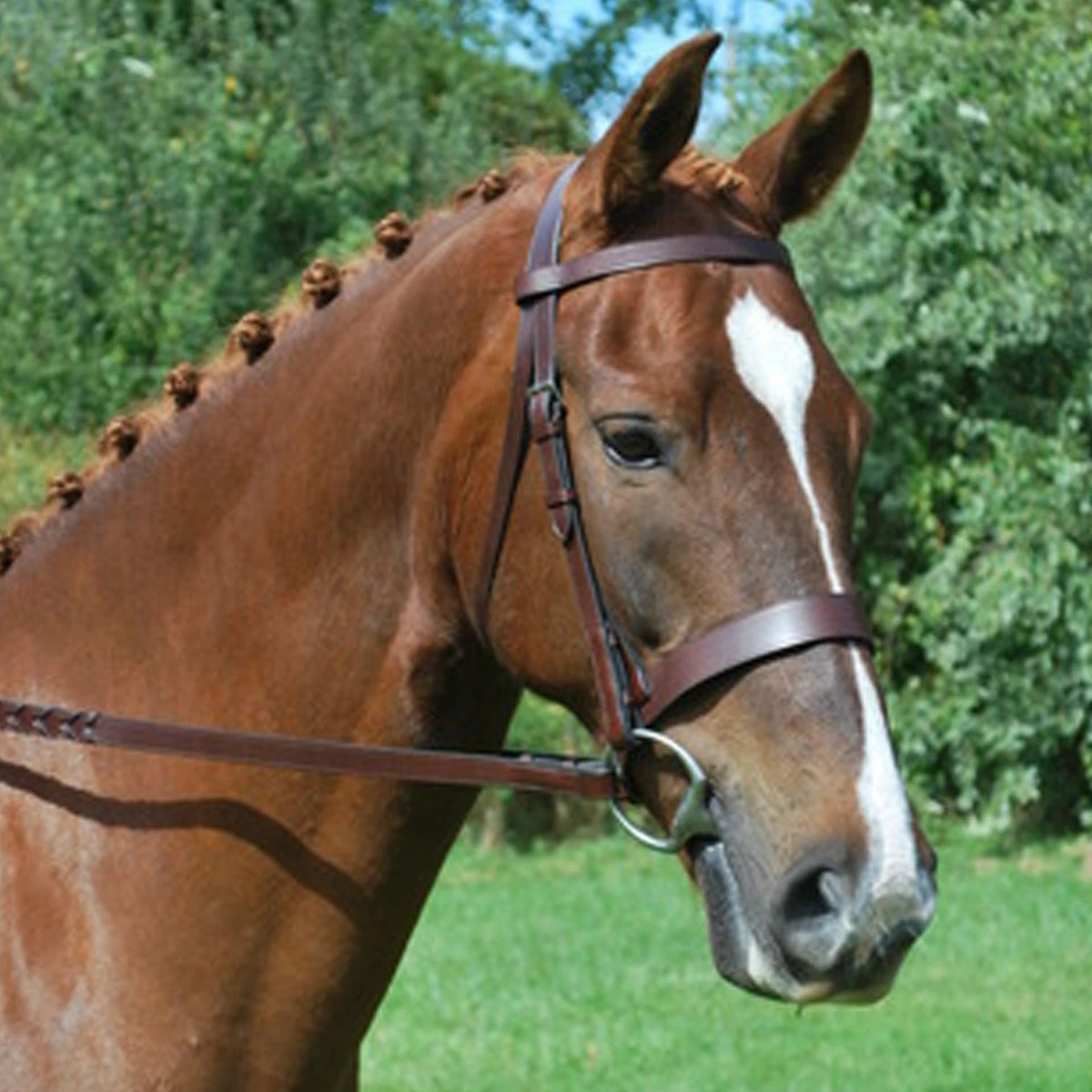 Made of the finest drum-dyed domestic leather, the Black Oak Foxtrot Hunt Bridle is an exquisitely crafted, traditional fox hunting bridle. The Foxtrot features a 1 1/4โ flat noseband, a matching 3/4โณ flat browband, 3/4โณ cheek pieces, and a 1 1/4โณ standard headstall. Comes complete with 3/4″ Laced Reins. All hardware is stainless steel, hook stud ends.