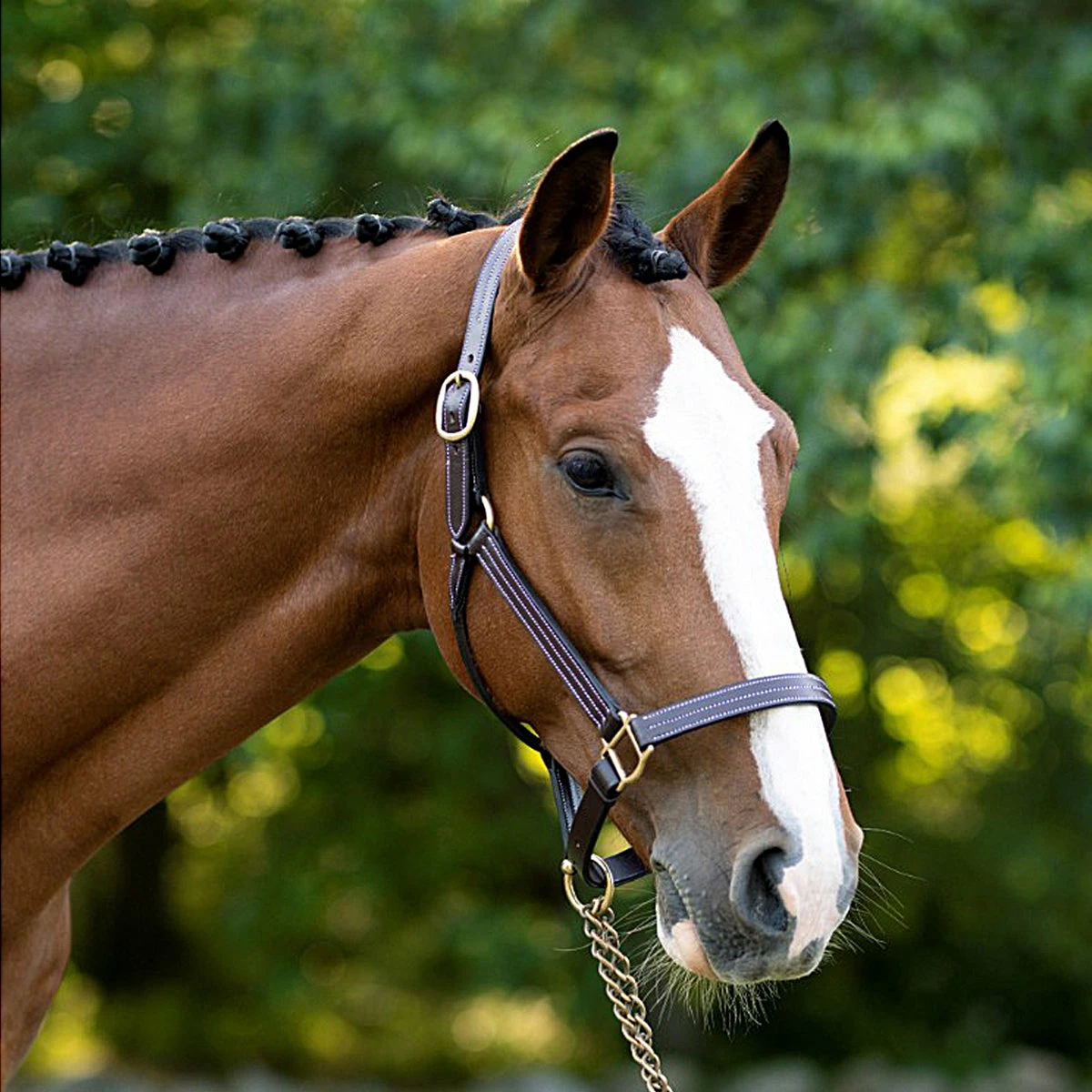 The Black Oak Pine is a brown unpadded halter with three rows of white stitching.ย