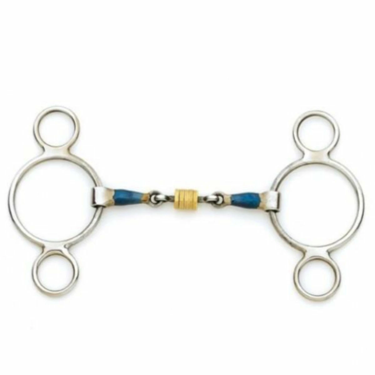 We love this Centaurยฎ Blue Steel 2-Ring Gag Bit with loose brass roller disks because it keeps your horse’s mouth quiet. The brass roller disks have a sweet taste and horses love the roller action on their tongue.ย ย The gag action encourages a horse to lighten in the front without stiffing through the shoulder and back.ย ย ย