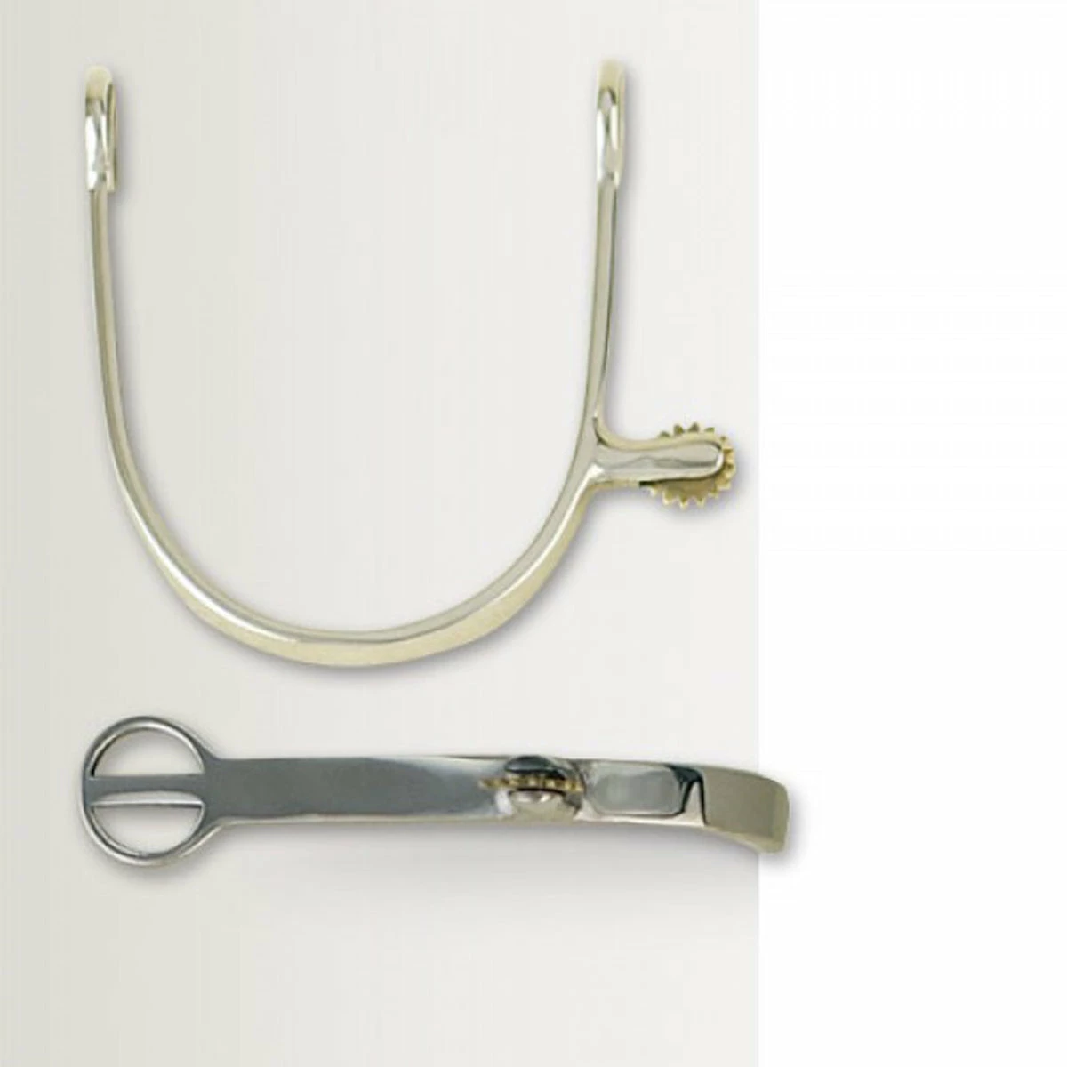 This spur has flat-sided branches with small pointed rowel on the inside. It helps aid in giving leg signals without the rider having to turn the heel into the horse. Lost wax cast and hand polished from the highest grade of 18/8 Stainless Steel.Â