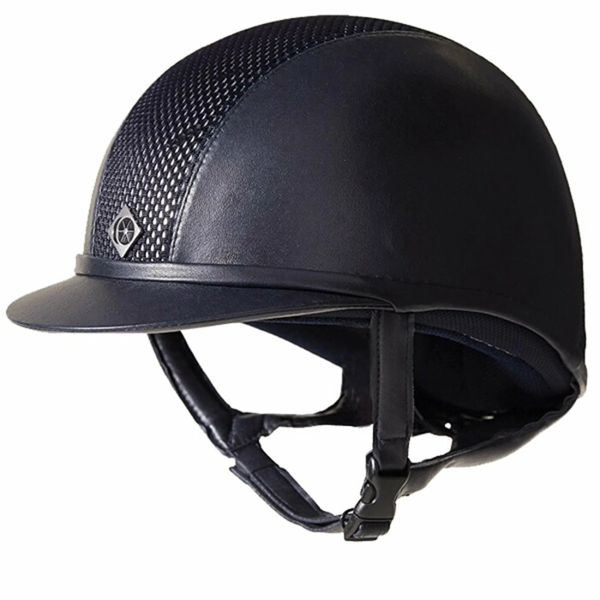 This low profile helmet features 12 centrally located front and rear ventilation slots covered in a smart breathable mesh. Heat reflective paint for the center panel is available in gold or silver. The side panels are covered in vegan leather and the helmet features a vegan leather-look GRpx® harness for unsurpassed stability and comfort.