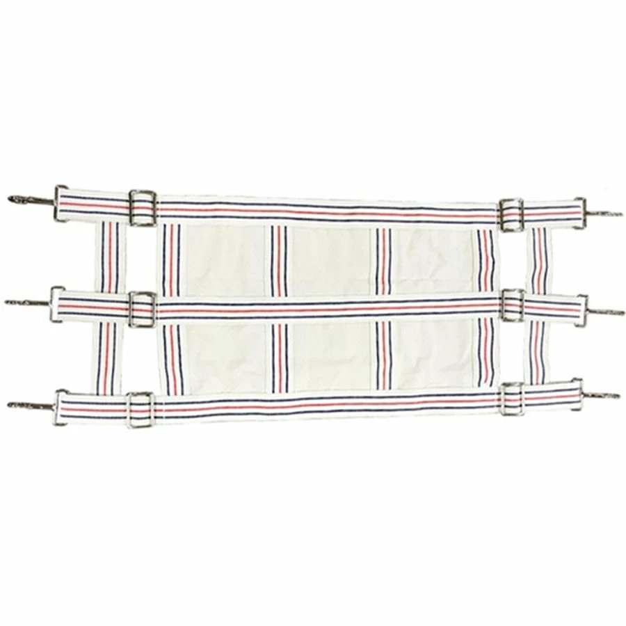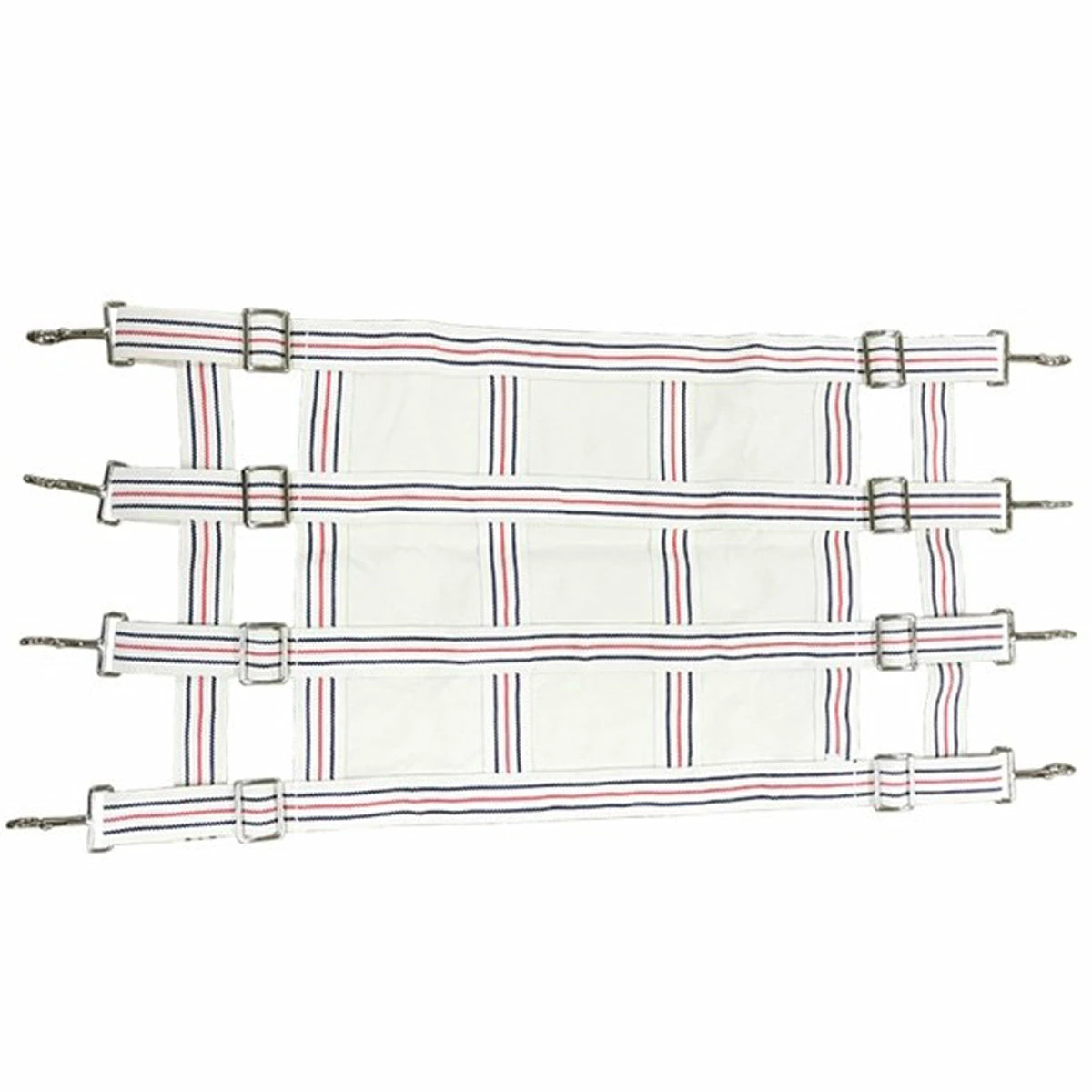 Cotton Stall Guard is made of rugged 2″ webbing stitched together. This white with royal and red striped guard is 16″ in height and adjust to 48″ in width. Heavy-duty nickel-plated hardware.ย Closed front to prevent the horse from putting a foot through it. Made with heavy-duty snaps.