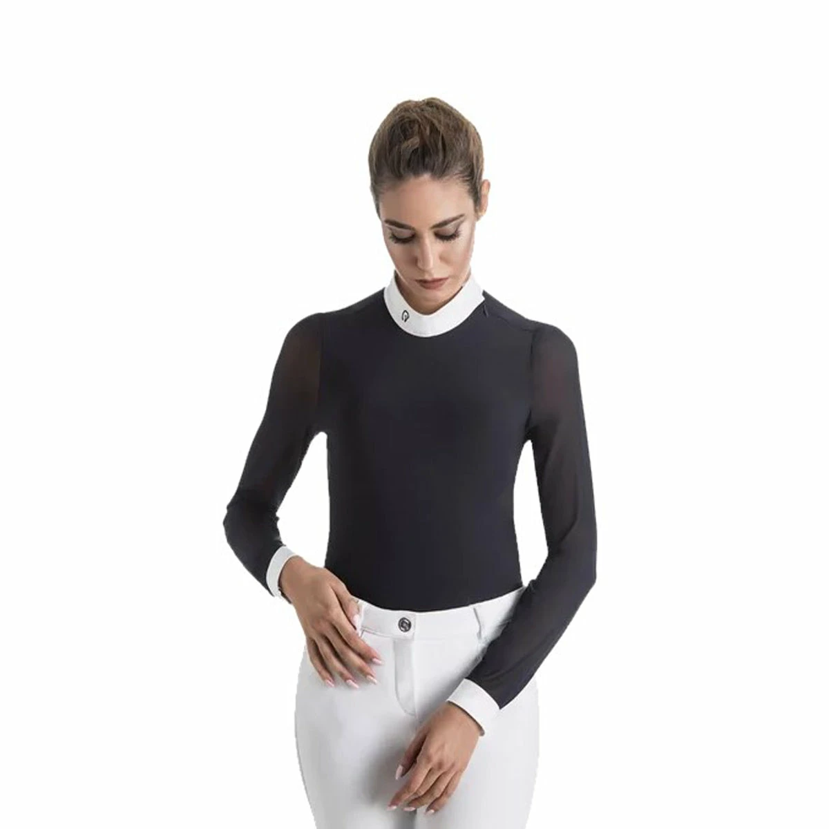 Rita, is a graceful competition shirt, with a delicate slender, and elegant cut. The revolutionary fabric, 100% made in Italy jersey, guarantees a perfect fit, comfort, breathability, and lightness. Thanks to innovative properties EGO7 Rita dries quickly, is antibacterial and anti-cease. In addition, the part of the transparent and incredibly breathable fabric gives a particularly feminine look. The hidden automatic buttons enhance the natural refinement of the simple white collar with embroidered logo.
