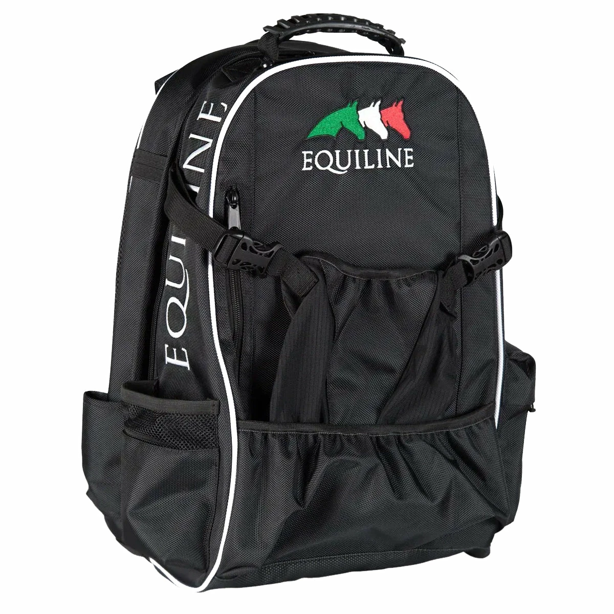 The Nathan riding equipment backpack zips open to two large sections; a suitcase-like section and a mesh zip section, ideal for a change of clothes after showing.ย Made in sturdy nylon the Nathan backpack can handle the horse show lifestyle.ย ย Embroidered with the Equiline Italian flag logo.