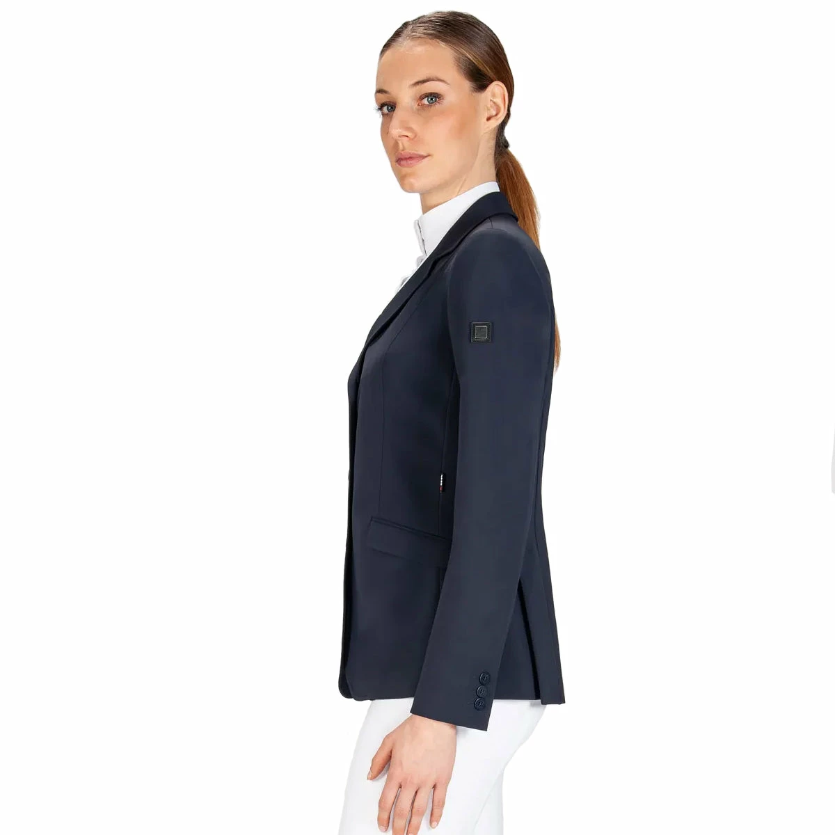 It is an elegant and traditional jacket for women with a double vent in the back and faux flap pockets in front.