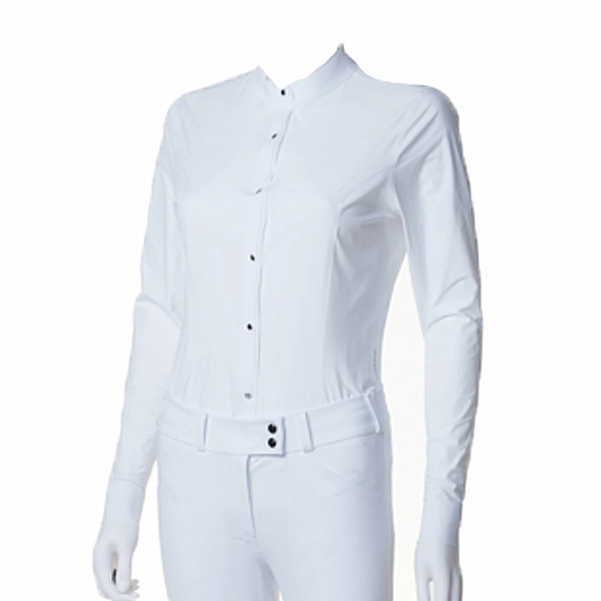 This show shirt has seamless, bonded assemblies for a unique experience of softness and comfort. It has a second-skin effect with open chest for a perfect fit and silhouette. Button closure snaps with laser-cut perforated bands at the top of the collar, placket and bottom of the sleeves for an elegant and sophisticated look.