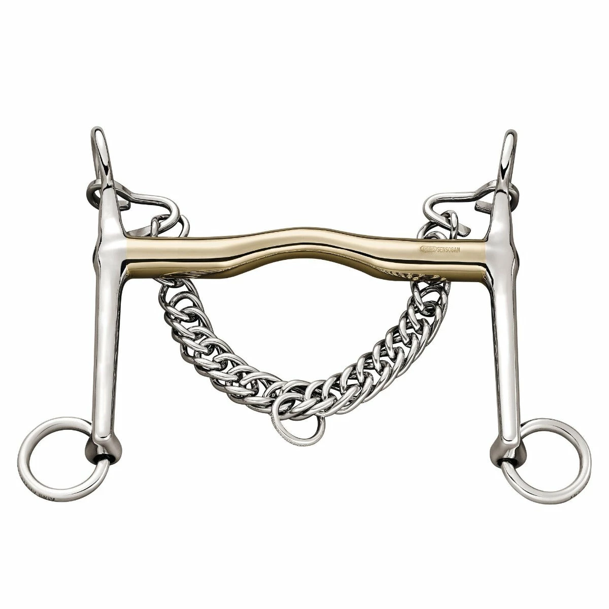 This unique Weymouth with its slanting mouthpiece and a smooth, rounded port is angled forward and enables the fine distribution of pressure on the tongue.