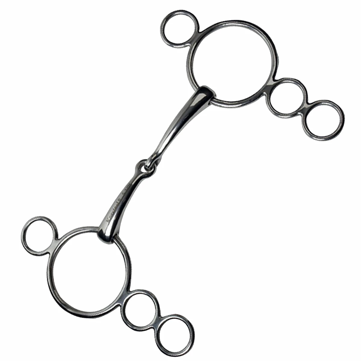 We love the JP Korsteel Stainless Steel Jointed 3 Ring Dutch Gag because the design of theย curved bars prevents the bit from hitting the roof of the horse’s mouth and eliminates the nutcracker-like action that can pinch a horse’s tongue. This Dutch gag consists of 3 rings: the top one where the cheekpieces attach and then 2 lower rings offering a variety of rein settings depending on how strong the rider needs the curb action to be. These are strong bits, typically used to encourage the horse to be lighter in front.ย ย