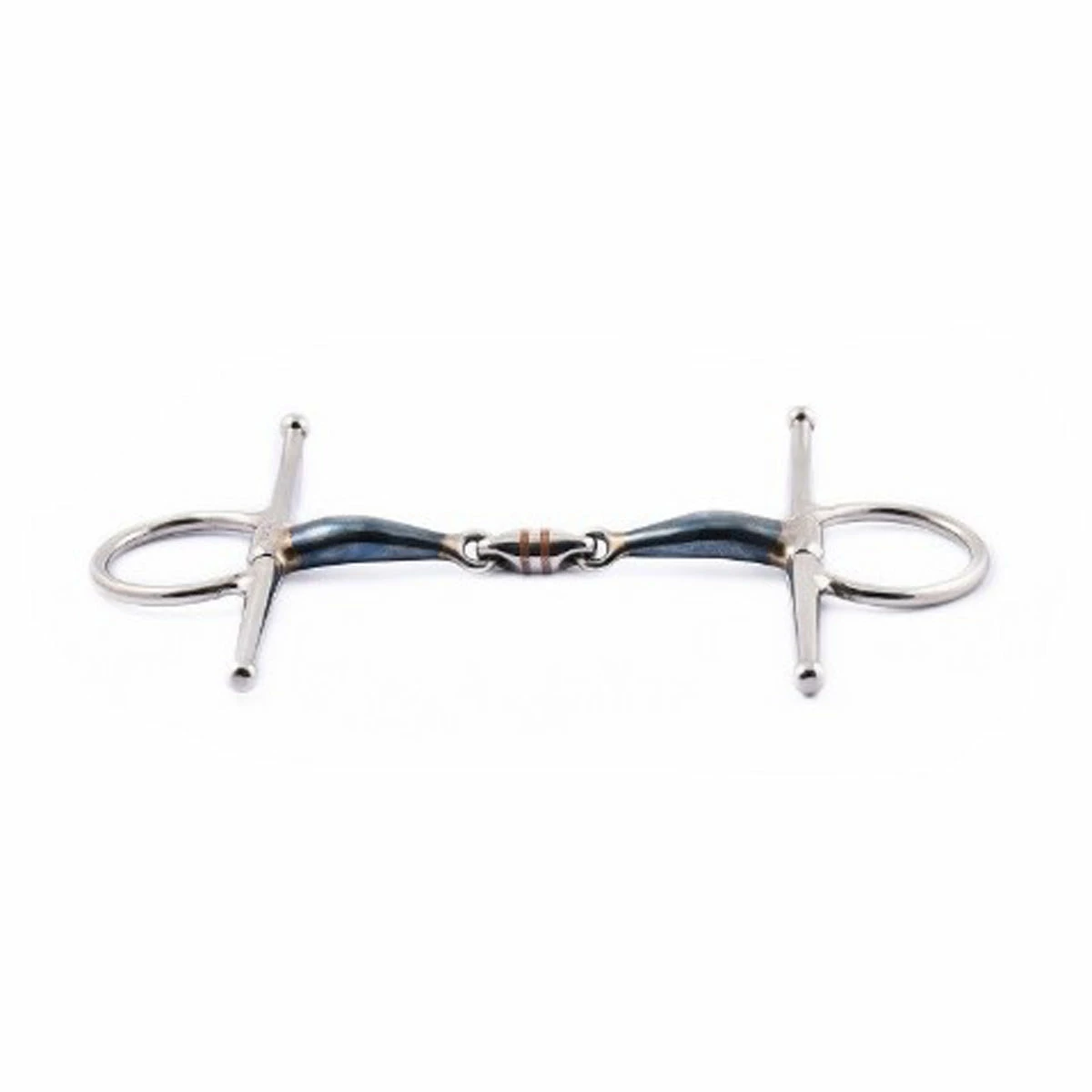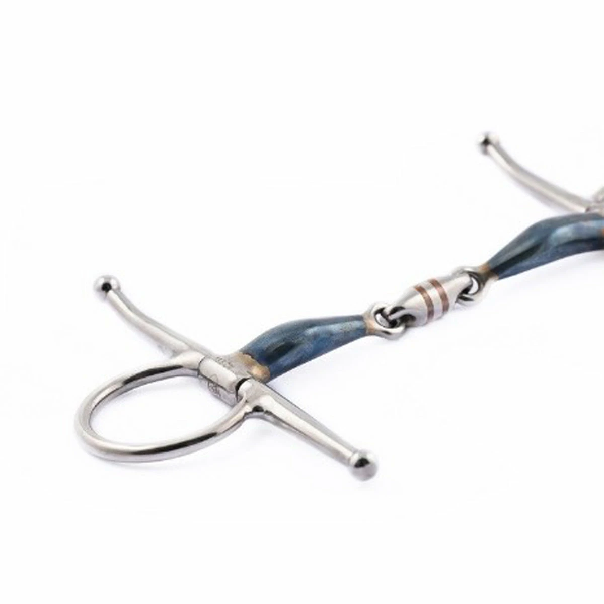 The Blue Steel alloy used in this JumpโIn range is made of 54% carbon and 46% manganese. Blue steel bit oxidizes with air and humidity creating a thin layer of rust which has a sweet taste. It will stimulate the production of saliva and naturally allow the horse to relax. The horse will be more comfortable and will take the bit more. The bit color will turn into a greyish brown due to this oxidation process