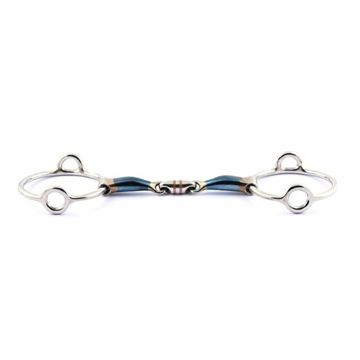 This bit has an action on the horse balance. It makes the horse rebalance and transfer its weight on the hindquarters. The larger the rings are, the stronger the gag action is. Blue steel bit oxidizes with air and humidity creating a thin layer of rust which has a sweet taste. It will stimulate the production of saliva and naturally allow the horse to relax. The horse will be more comfortable and will take the bit more. The bit color will turn into a greyish brown due to this oxidation process.