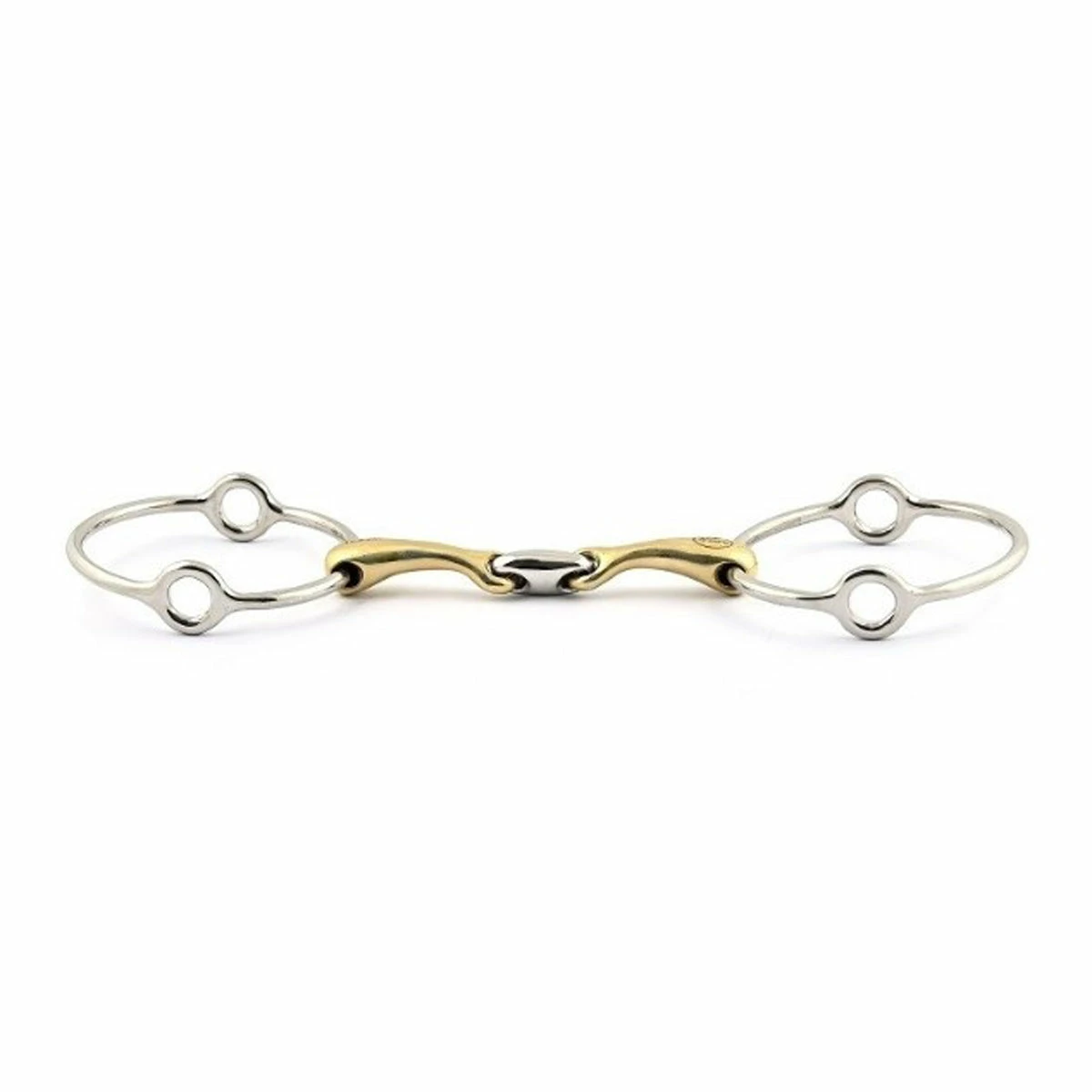 This bit needs special cheek pieces and can be used directly with two reins, with bit loops or with four reins. The self-blocking mechanism will make this bit action stronger if the horse takes a too strong contact. This bit has an action on the horse balance. Itย makes the horse rebalance and transfer its weight on the hindquarters. The larger the rings are, the stronger the gag action is.