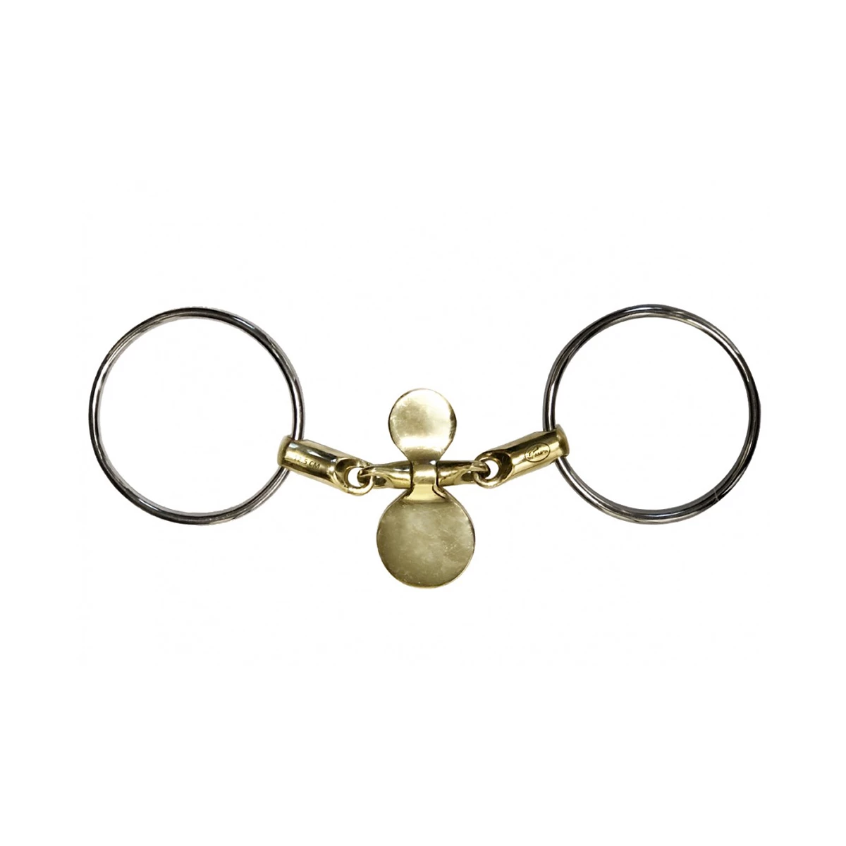 Composed of a Germanย Silver alloy that encourages natural salivation, this loose ring features aย 360ยฐ pivoting large double disk that lays flat on the tongue at all times so it can prevent the tongue fromย ever going above the bit