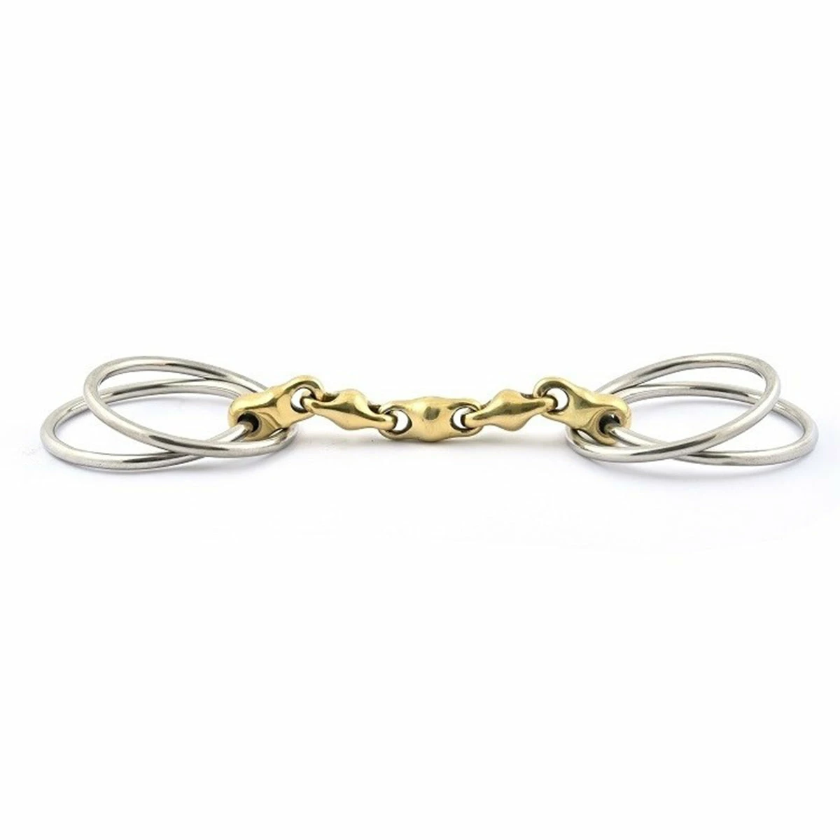 Featuring 70mm rings, 17 mm mouthpiece, and composed of a German Silver, a relaxing and solid alloy. This bit is unique in the fact that breaks up the pressure points on the horse. Comprised with 4 rings, the “loose” inner rings are attached the the cheekpieces and the outer rings are connected to the reins. The bit squeezes the cheeks as opposed to pulling on the bars of the mouth.ย