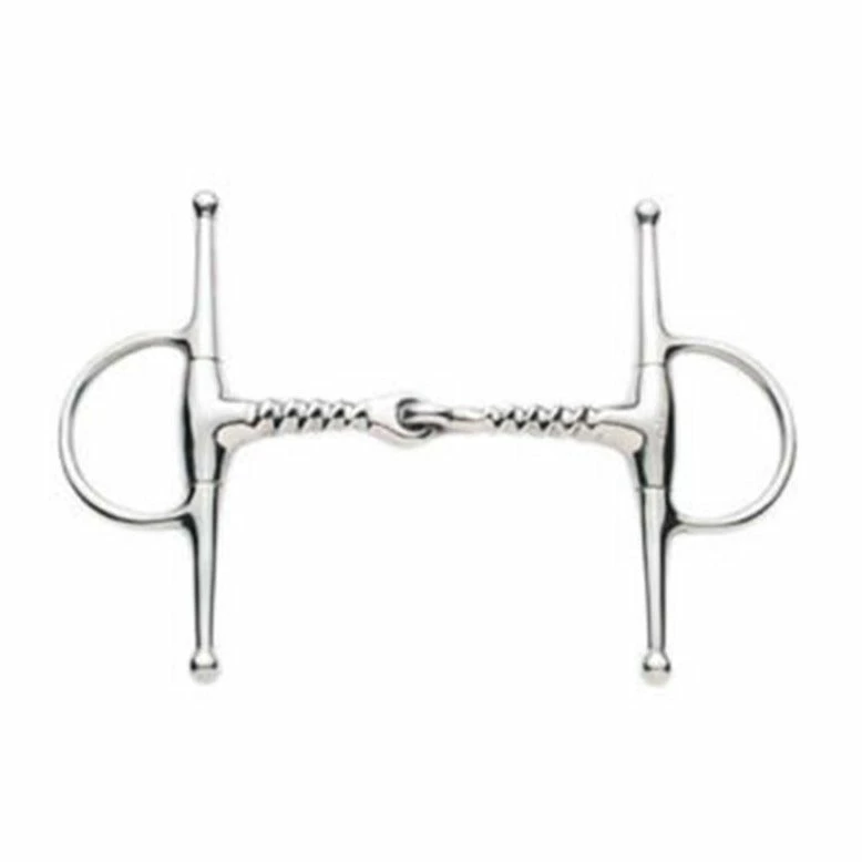 We love the Korsteel Stainless Steel Corkscrew Mouth Full Cheek Snaffle Bit because the full cheek snaffle has narrow arms which project above and below the rings, preventing the mouthpiece from sliding in the horse’s mouth and to emphasize the tuning aid. The corkscrew design puts pressure on the tongue, bars, lips, and palate, offering more control over stronger horses. The single joint applies a nutcracker action that applies pressure to the tongue, the bars of the mouth, and the horse’s palate.ย