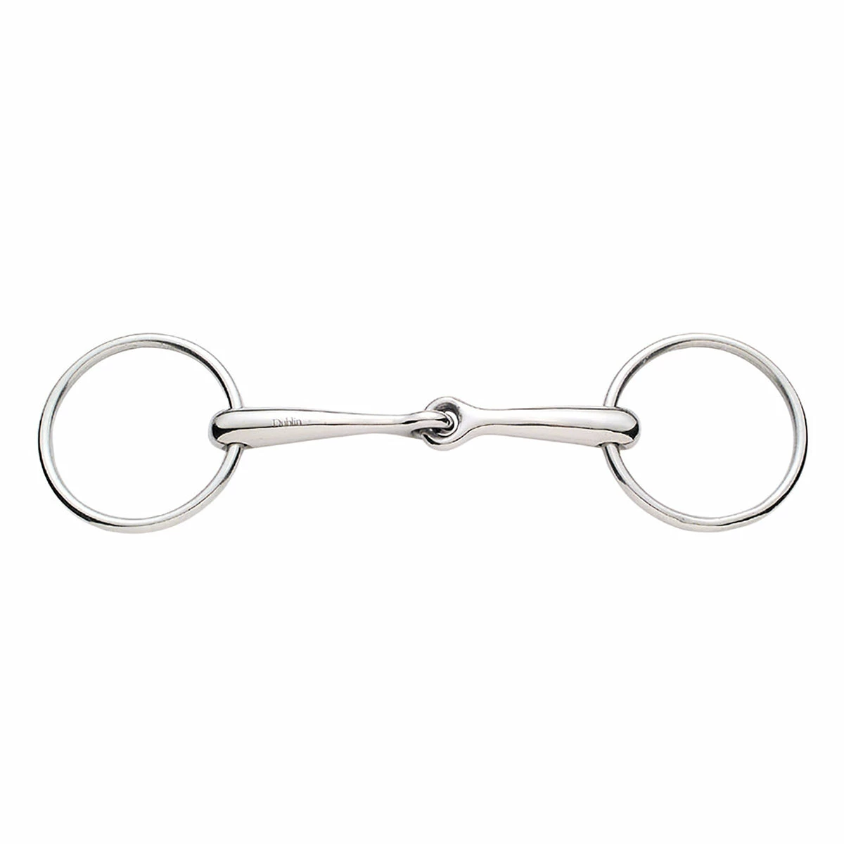 We love the Korsteel Stainless Steel Solid Mouth 16MM Loose Ring Snaffle Bit because of the more rigid construction with cheeks that allow the mouthpiece to slide on the rings before the horse feels the bit’s action.