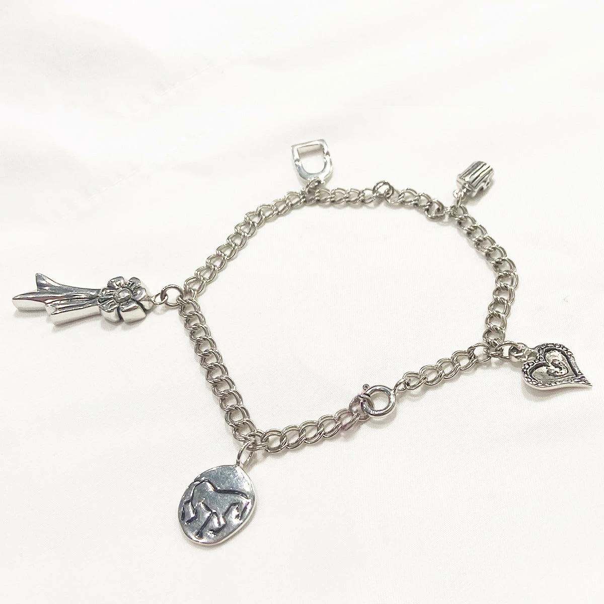 Sterling silver link bracelet with 5 equestrian themed charms. Made in the USA.Â