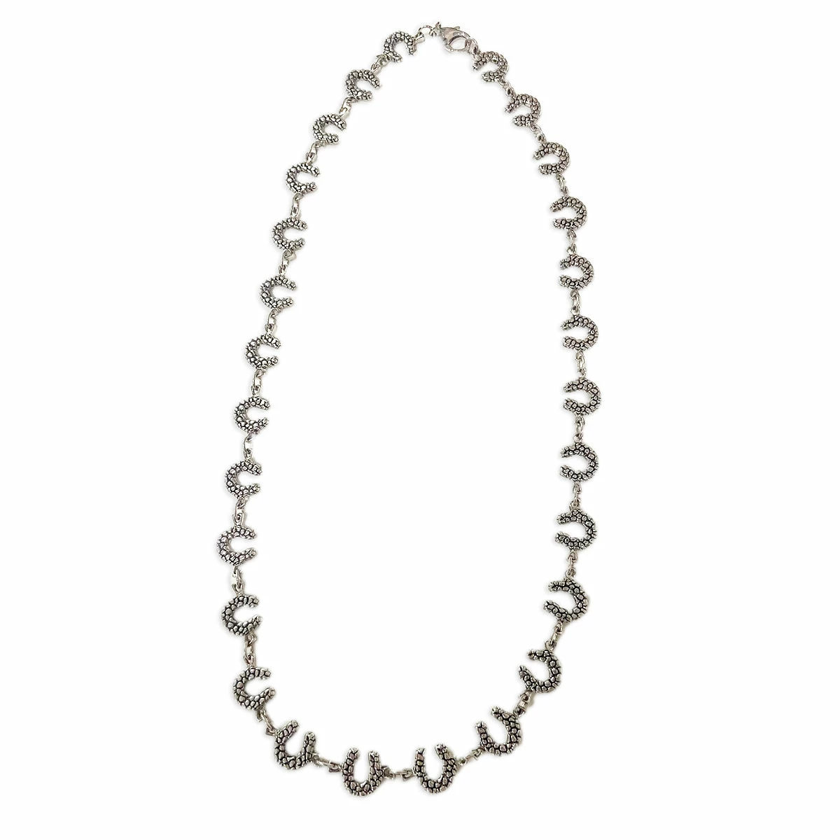Sterling silver linked horseshoes with pebbled texture. Made in USA.