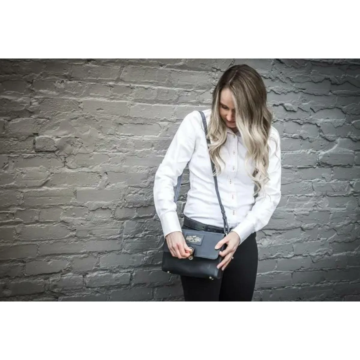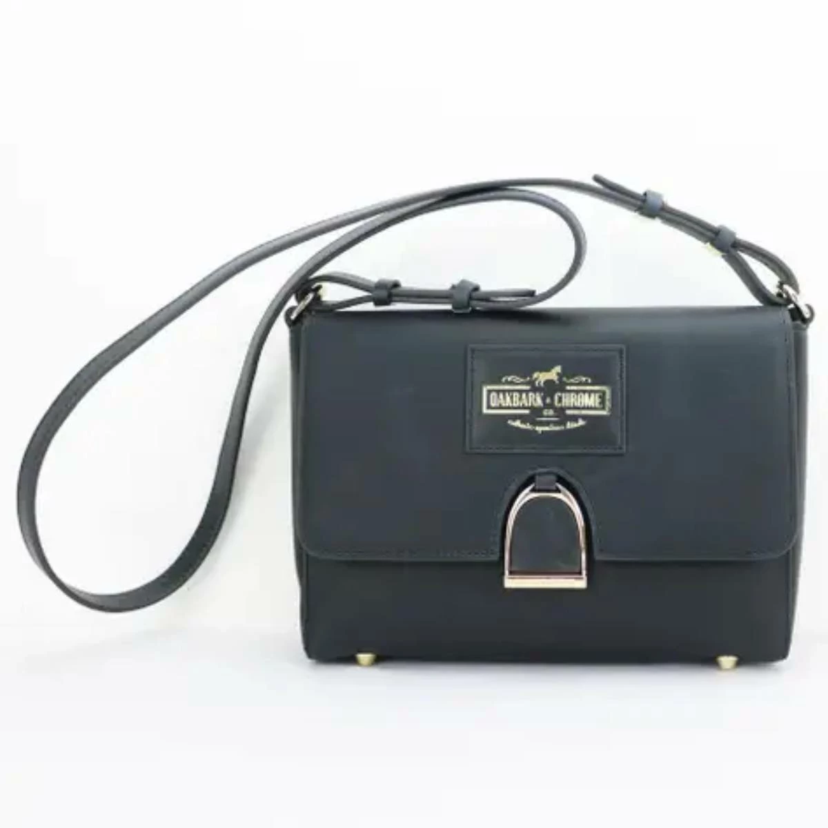 Shoulder bag in dark blue-black raw leather. Oakbark & Chrome’s shoulder bags are loved by both equestrians and non-equestrians alike with their thoughtful features: tactile top grain leather (looks better the more it is worn!), the front stirrup clasp (ensuring nothing falls out), the stabilizing feet (keep the bottom clean), and itโs classic herringbone lining.