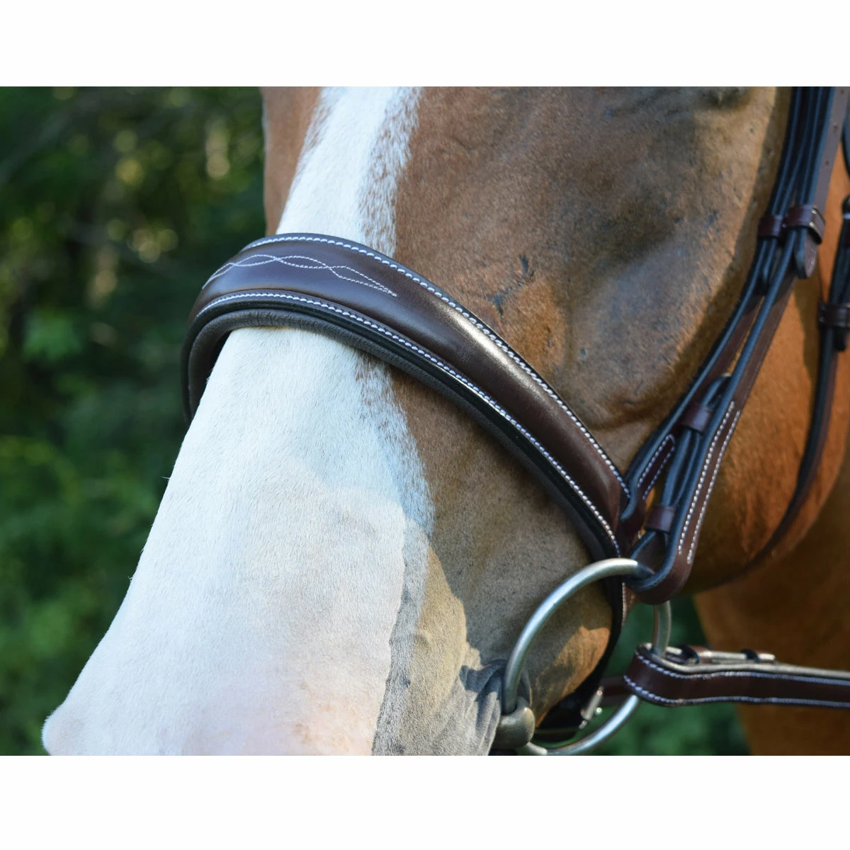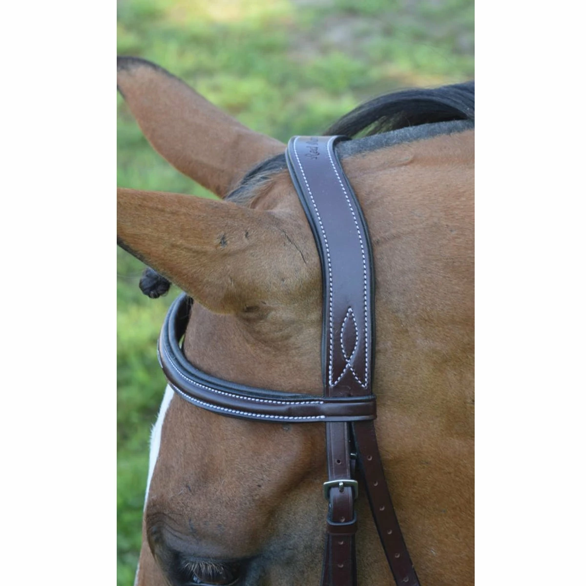 Understated design with maximum affect. The Ocala bridle features a subtly shaped noseband and browband, as well as our ergonomic uni-crown headstall. The soft padded, round raised fancy stitched noseband measures 1 1/2โณ at its widest and gently tapers down to 1 3/8โณ on each side and the browband measures 1โ in the center and narrows to 1/2″ on the ends. Comes complete with 5/8โ fancy stitched round raised Laced Reins. All hardware is stainless steel, with hook stud ends, and a roller buckle on the noseband. This bridle is made of the finest Grade A English Sedgewickโs leather.