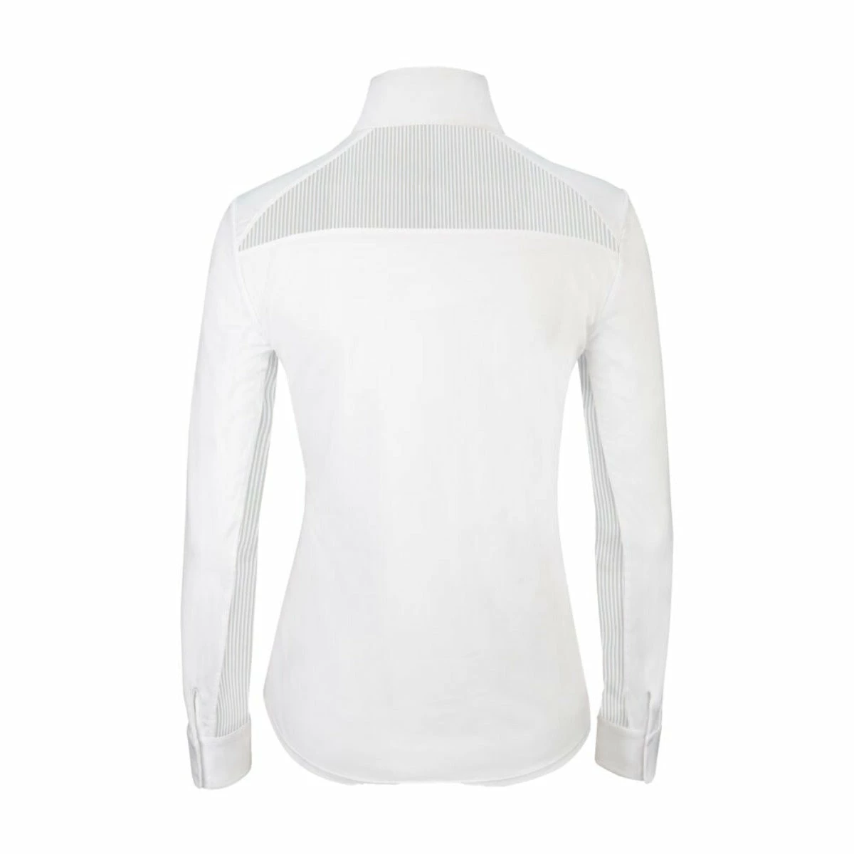 The Carly shirt will be the perfect addition to your show clothing wardrobe with its unique mesh back and underarm panels and cutting-edge technology. The fabric features 37.5ยฎ patented thermoregulation technology which has proven to help your body manage its core temperature and therefore, increase stamina. It keeps you comfortable by helping your body to maintain an optimum core temperature of 37.5ยฐ Celsius (99.5ยฐ Fahrenheit) which is ideal for peak athletic performance. The particles are naturally derived and work for the life of the product (it will never wash out!). The zipper placket with snap collar modernizes this traditional look.