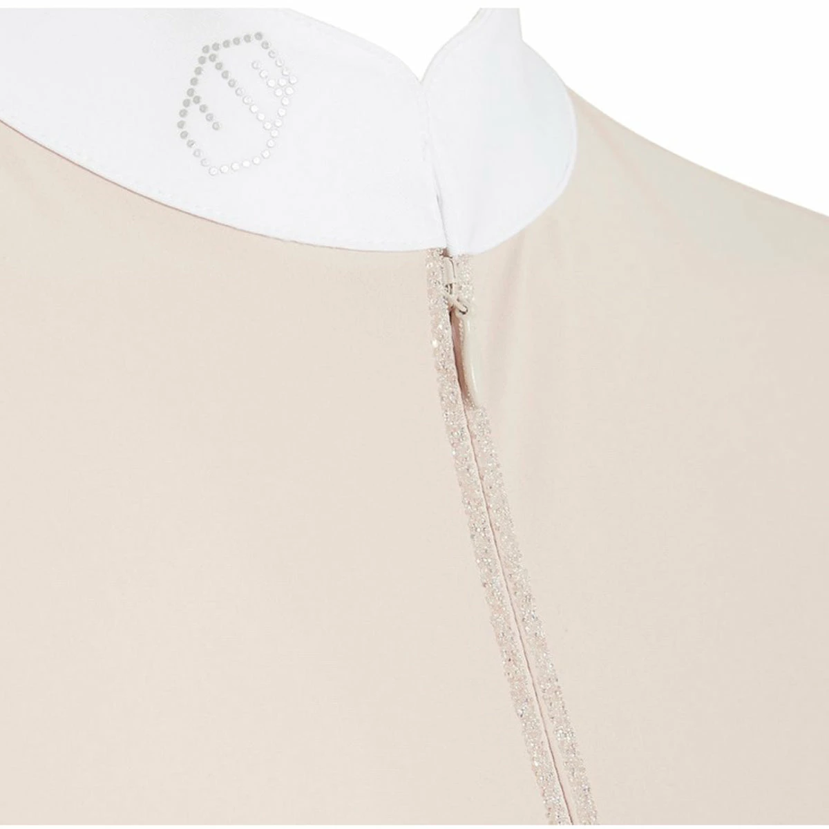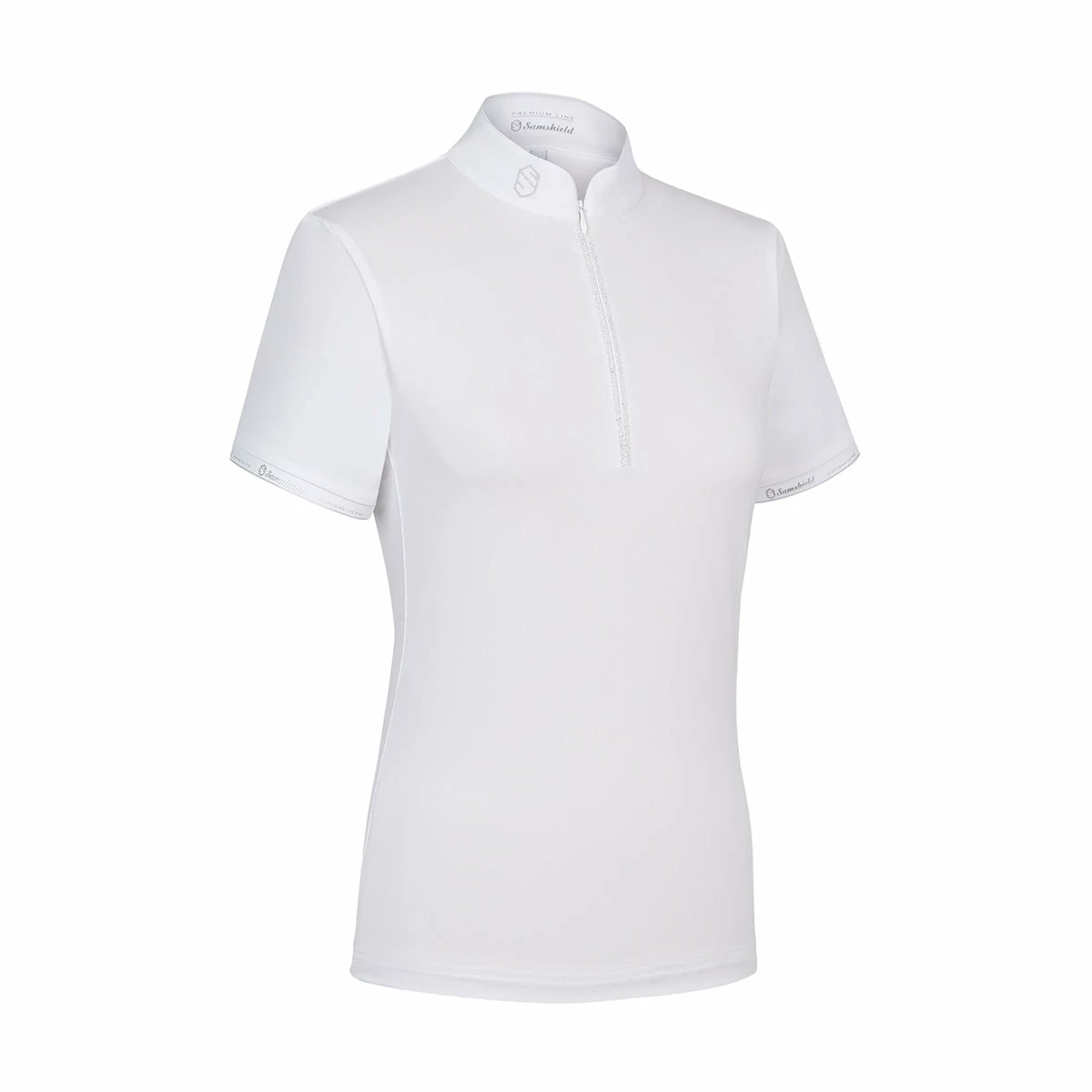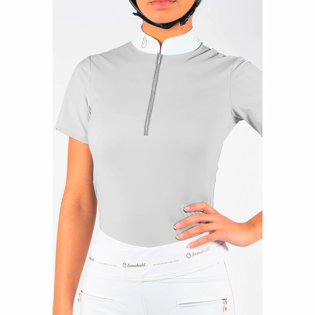 The Aloรฏse short sleeves shirt is designed with an ultra-soft high stretch fabric which ensures high breathability and comfort. The tailored fit provides an excellent positioning when active for an optimal comfort. The collar closes with an invisible zipper and is embellished with Crystal Fabric Swarovski. The logo Samshield printed on the sleeves, the metal dots blazon on the collar and print and metal dots on the back give the Aloรฏse top elegance and distinctiveness in a sporty-chic style.
