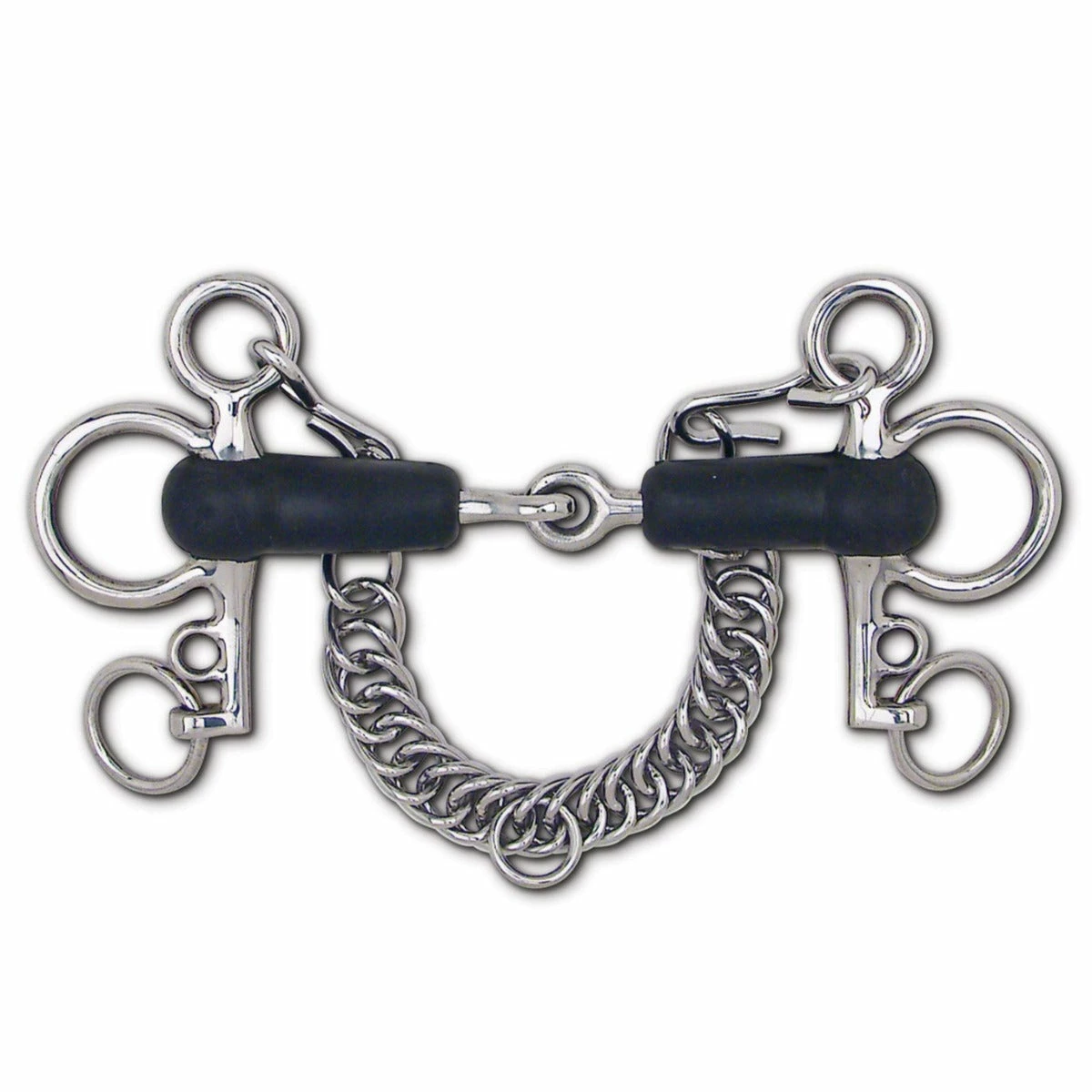 This bit is perfect for the horse who pulls a little but has a soft mouth. The leverage action will discourage the horse from leaning or pulling on the rider’s hands, while the rubber jointed snaffle mouth encourages the horse to move forward into the bridle.ย