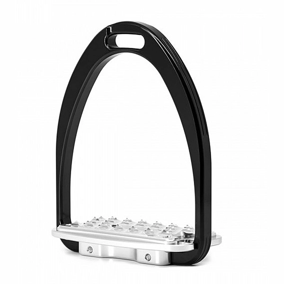 Made in Italy, the patented Turin Tech Stirrups are made from aluminum billet and fitted with stainless blocked screws. Designed for the Hunters, the replaceable treads are treated with nano-ceramic coating, while the rings are treated with a 20 micron adonization to preserve their beauty. The treads feature a 4 degree angle to encourage proper positioning, and they are aggressively patterned to provide grip in any weather and footing conditions. Strategically placed stirrup leather eyes provide rider comfort and assist in retrieving lost stirrups. Logo-free branches make this the perfect blend of high tech and traditional sought after for the hunter ring.