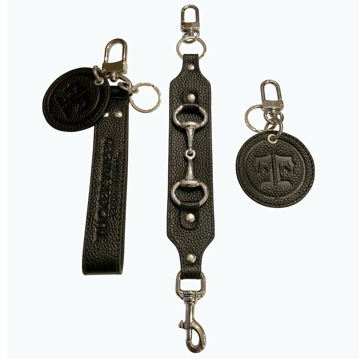 Black leather with embossed Tucker Tweed text, Silver bit on reverse side, featuring valet clip, keychain and snap.ย Dimensions:ย ย 12โ x 1.5โ 2.5 oz