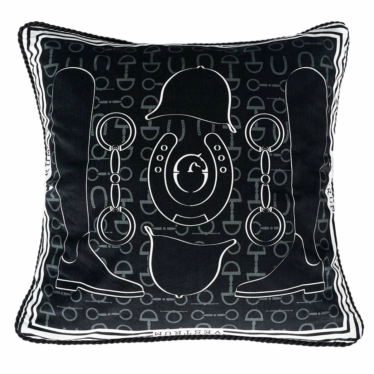 Pillow with Vestrum special equestrian design in the elegant black and white tones on one side and with the Vestrum exclusive texture on the other side. Perfect for your living room, house or horsetrucks. Pillow made of a very soft cotton.